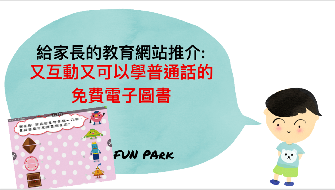 各位家長,相信您們也會帶孩子到公共圖書館借書,但您又知不知道圖書館網站提供了一個免費電子圖書庫,孩子既可以學普通話,又可以互動地以遊戲方式閲讀學科知識? 您只需要有圖書證的號碼和密碼,就能登入Fun Park 電子圖書庫。這個圖書庫有很多不同學科、詩詞等的電子圖書。圖書是普通話有聲書,但有趣的是,Fun Park以闖關方式,讓孩子以遊戲的方式學習學科知識。實在值得推介!