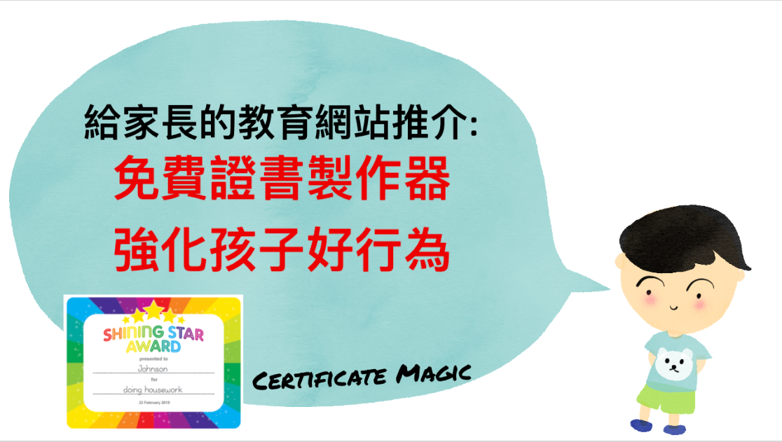 要強化孩子的好行為有很多方式,除了口頭鼓勵外,我們可以設計一些個別化的小禮物,認可孩子的好行為。這不一定是物質,也可以是一些個別化的鼓勵,例如有孩子名稱的書簽、獎狀等。今日,我會為大家介紹外國一個免費自製證書的網站。個別化的證書可以讓孩子知道父母是精心製作,亦讓孩子知道父母重視自己的好行為。