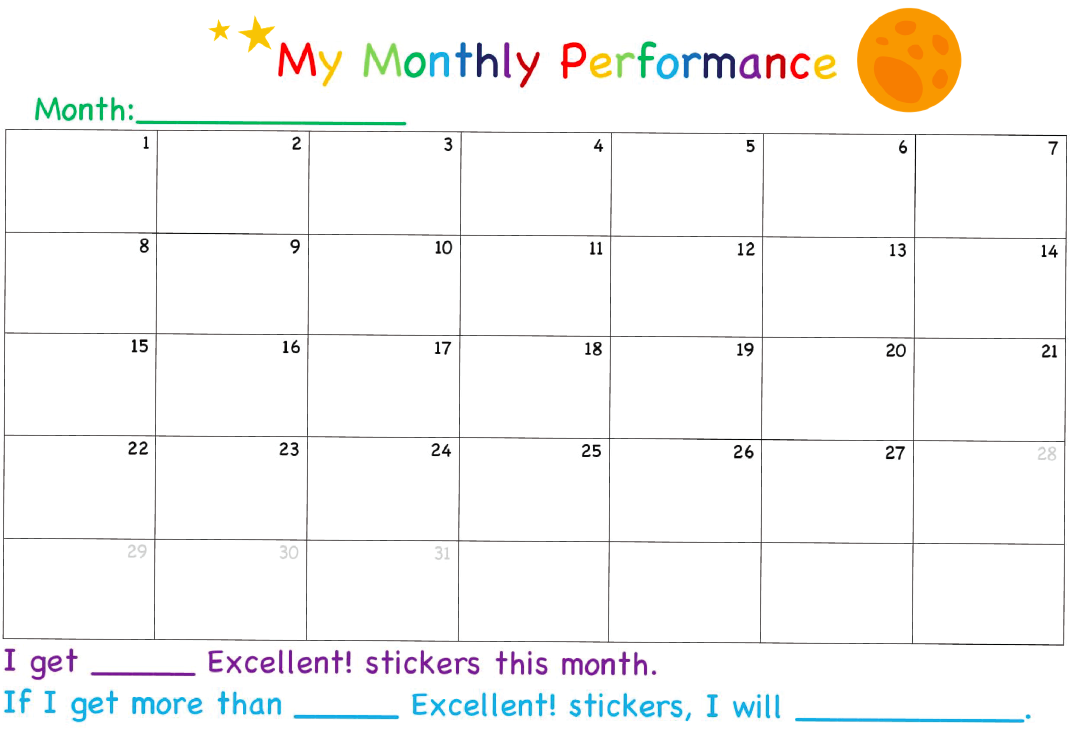-每月結束日,讓孩子數excellent! (表現好!)貼紙的數量,並與孩子認真檢討做得好的地方。