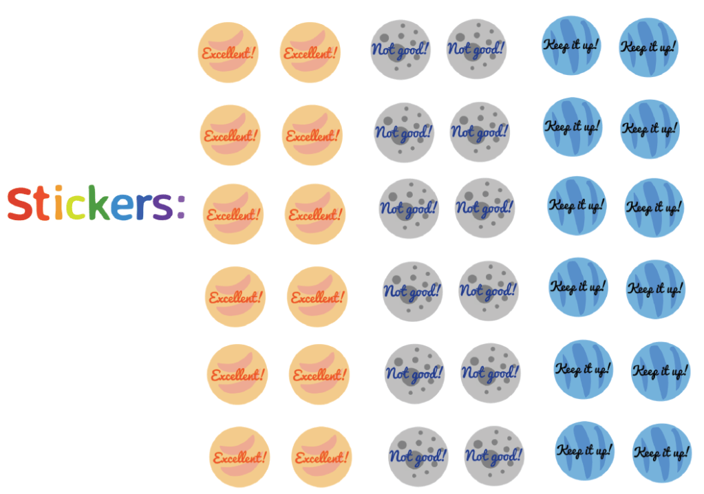 -叫孩子貼excellent! (表現好!) 、keep it up! (繼續努力!)、not good! (不好!) (請用180gsm以上 白紙列印第三頁貼紙,並用blue tack 貼,以循環再用)