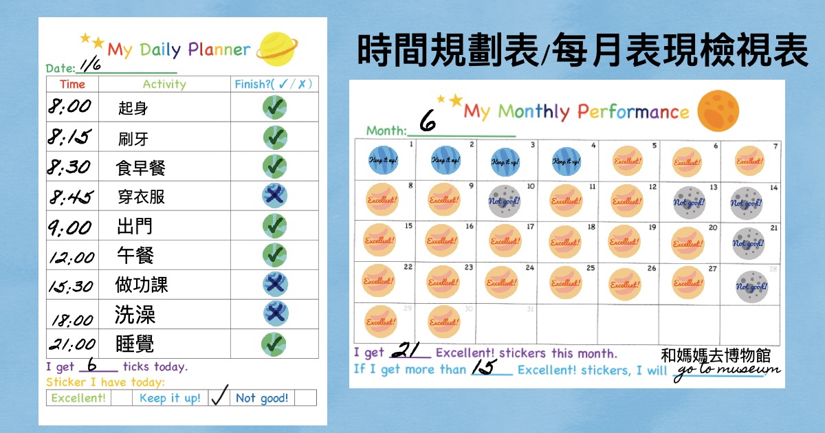 時間規劃表及每月行為檢視表是特別為6-12歲孩子設計,讓孩子建立日常生活中的好習慣。很多孩子都未能自動自覺完成每天的任務,例如,每天回家後,要家人提點才做功課;晚上看電視節目後不願睡覺。之後可能出現的情況是父母與子女發生衝突、或者孩子建立了壞習慣後,就改不了。