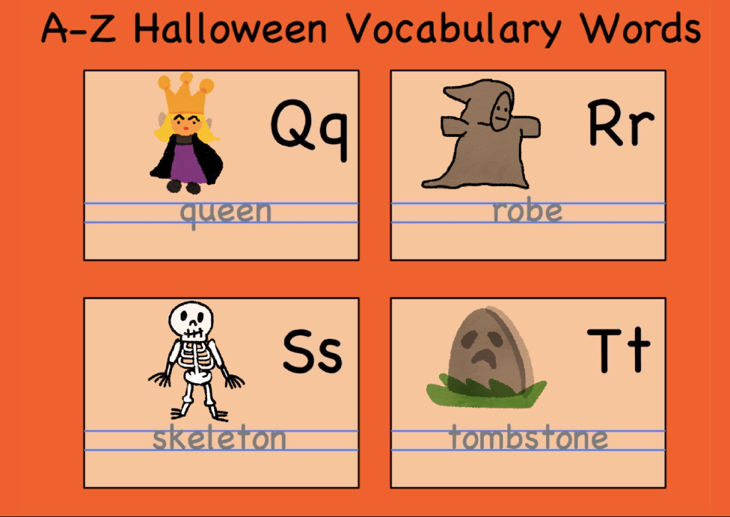 5.寫:在萬聖節A-Z詞彙寫字卡上寫灰字