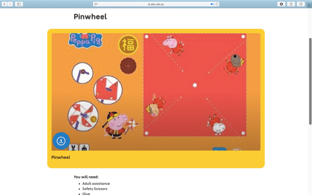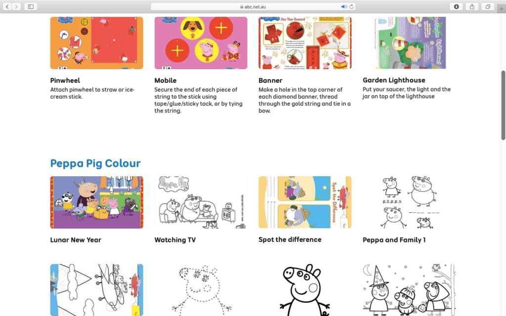 在外國,有很多兒童產品網站都會有一個免費的部分,讓孩子可以下載和產品相關的學習工作紙。今天,要介紹是澳洲ABC Kids 頻道平台。雖然因為地域限制,我們不可以看到他們的免費卡通片,但我們就可以免費下載不同卡通人物,包括Peppa Pig 的填色、遊戲、手工藝工作紙等,讓就讀幼稚園的孩子使用。