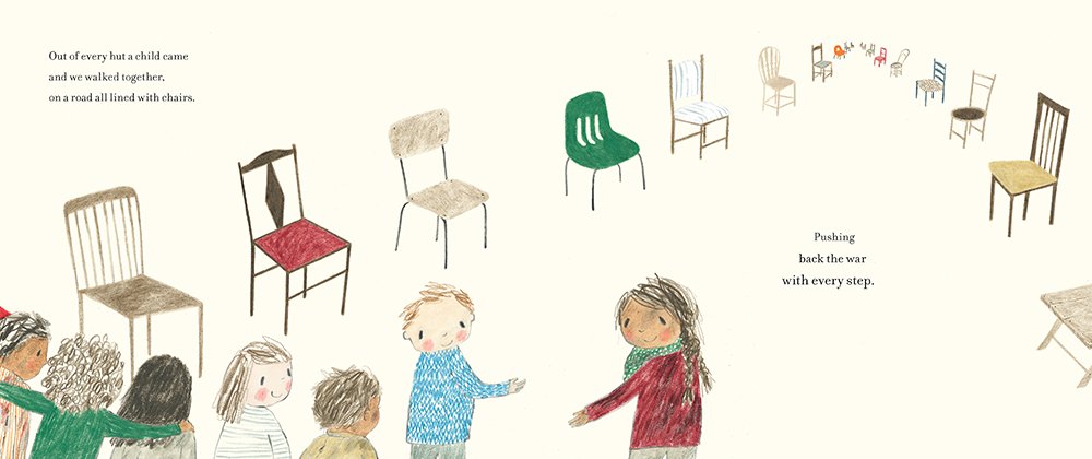 突然間,課室裏有一個孩子將椅子讓了出來。更多的孩子也把自己的椅子讓了出來。這是一幅最美麗的插畫: