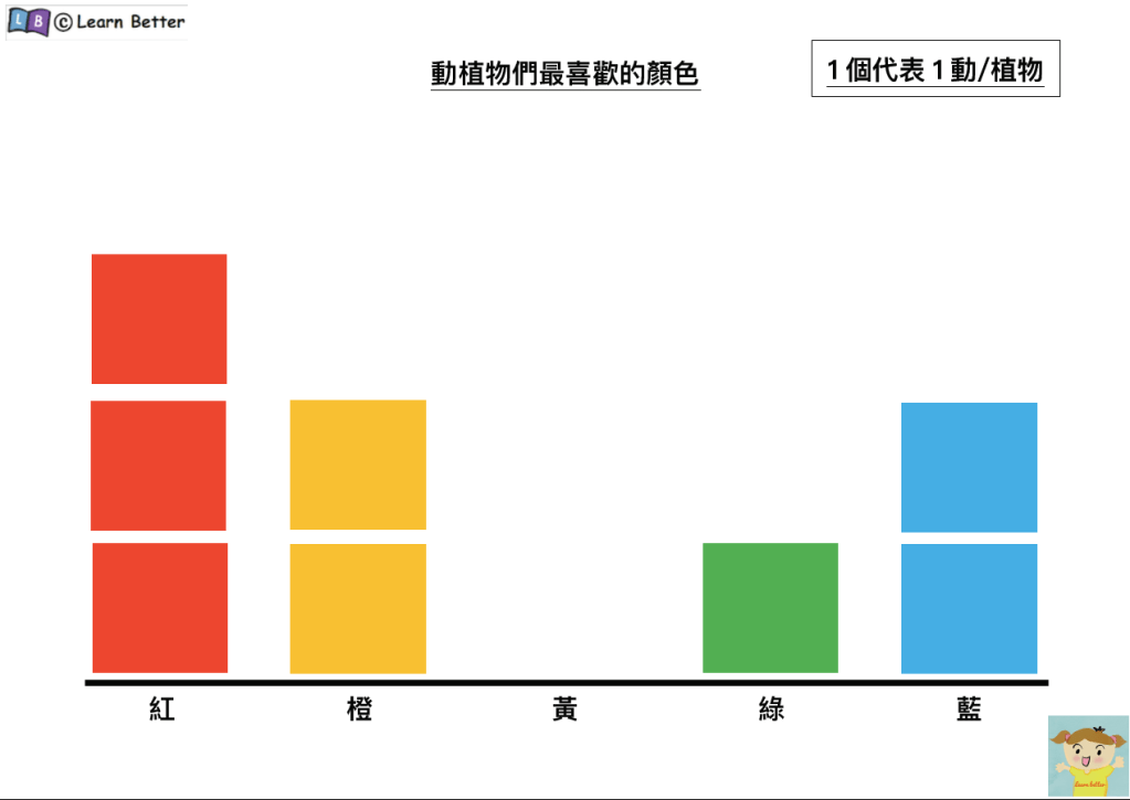 3A. 有一班小動植物會說自己喜歡的顏色。家長叫小朋友利用統計卡記錄小動植物喜歡顏色的數量。