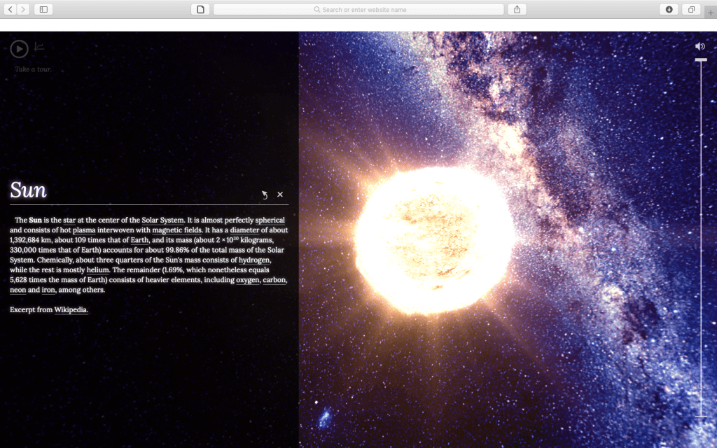 這是一個很特別的網站,一進入這個網站,就像去了一趟宇宙旅行。我覺得無論是大人,或者小孩子,都應該要進入這個網站看一下。這是一個由Google Chrome研發的網站,透過這網站,你可以看到恆星和太陽系。這是一個很好的教育網站,因為你可以和孩子由遠到近看這個宇宙,並可以點擊恆星,學習其資料。我唯一給大家的提示就是,用電腦去看!