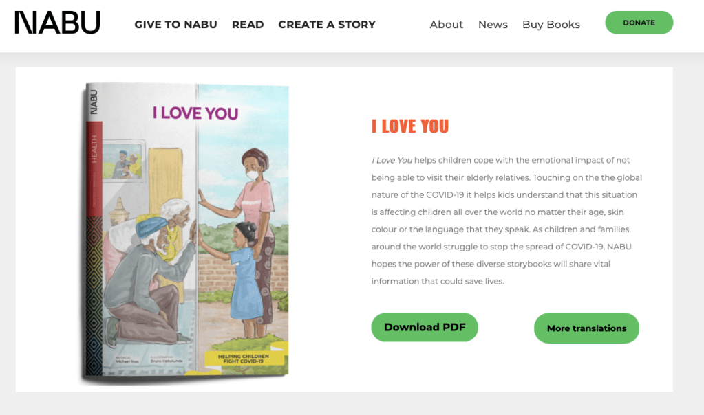 不知道大家有沒有聽過NABU這個機構?它是一個國際機構,透過分享免費圖書,讓世界各地的小朋友都有機會閱讀。在肺炎期間,他們推出了一本叫做I love you 我愛你的圖書。今天,我想和大家分享這本英文圖書,內容是講述一個Rwanda 盧旺達孩子在肺炎期間想見到公公婆婆的故事。我特別想推介這本書,因為藉着這本書,我們能教懂孩子顧及身邊長者的健康情況。另外,這本圖書出現多個國家,讓孩子藉着閱讀圖書,了解世界各地不同的文化。最後,我也想再次表達感恩,感激這個世界上,有一些無私的人付出,讓更多孩子可以免費得到閱讀的樂趣。