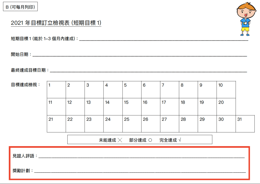 我們設計了A Form或者B Form。如果目標需要每天進行檢視,就要使用A form,例如每天要在七時前完成功課;如果目標只需要每周進行檢視,使用B form即可,例如每星期做30分鐘運動。
