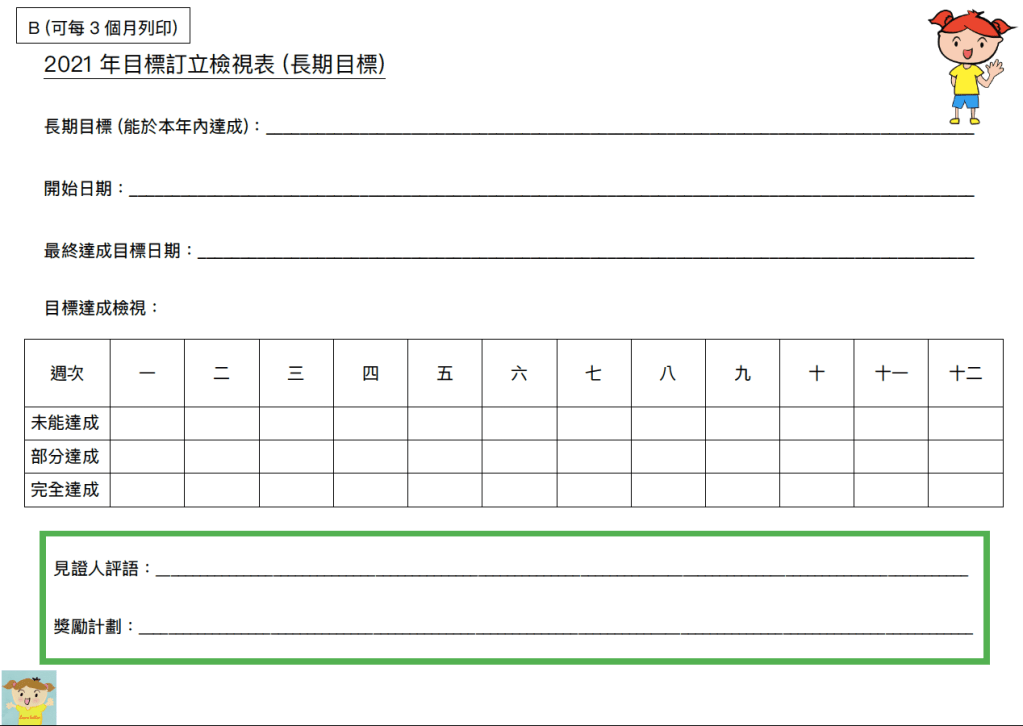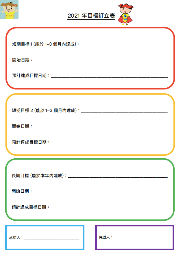 上年度,我們也曾經推出2020年目標訂立及檢視表。本年度,我們進行設計上及內容上的修訂。我們的目標是,孩子能真真正正地實行目標,將目標變成生活上的一種習慣,持續地實踐。正因為這個緣故,我們鼓勵家長在下載目標訂立及檢視表後,花時間閱讀本文的使用方法及為孩子訂立目標的技巧,這樣孩子就更能達成目標了。